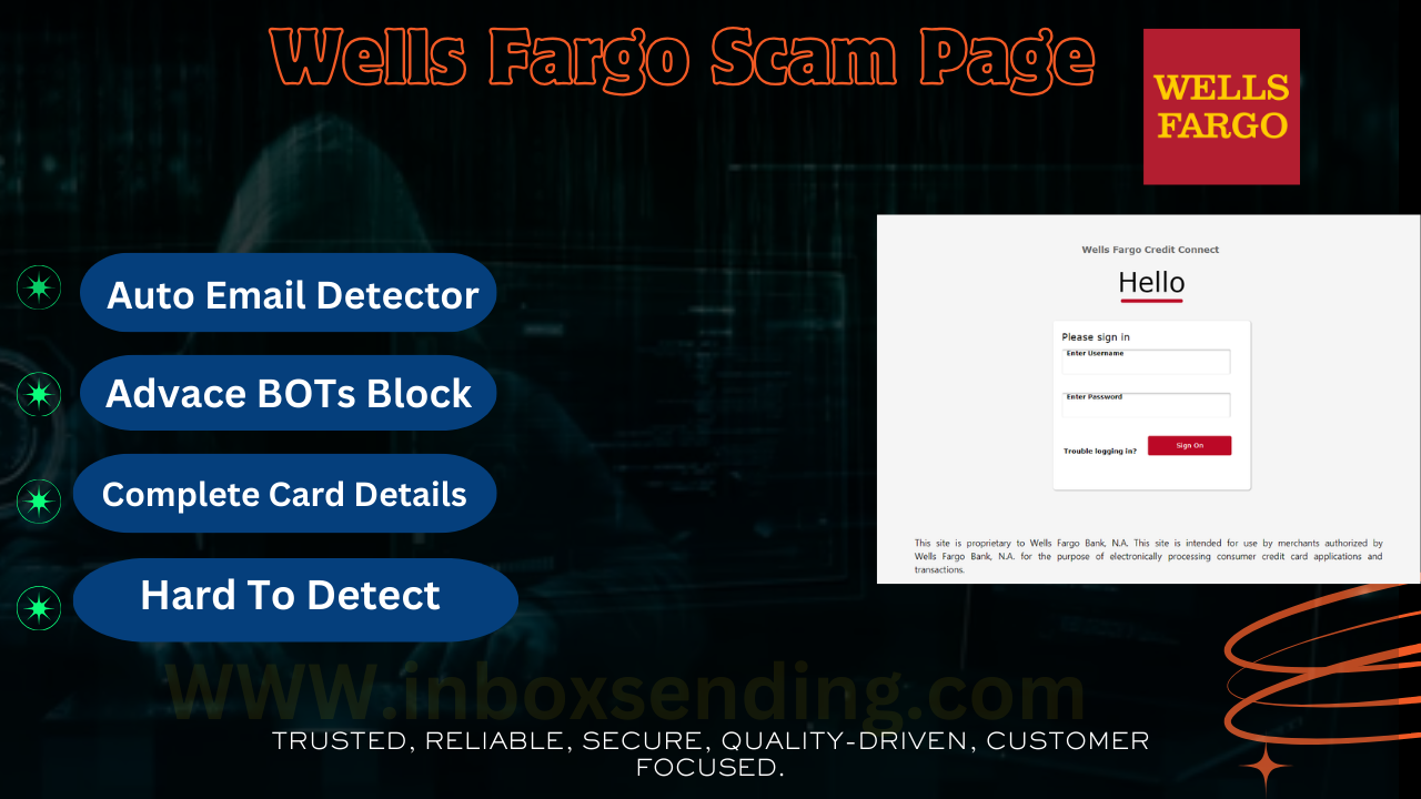 Introducing the latest Wells Fargo bank scam page, equipped with advanced bot blocking and fully encrypted for enhanced security. This scam page includes smart inputs to validate user details and captures complete card information. With an auto email detector and provider detection, it’s designed to be difficult to detect. The page also seamlessly redirects to the original Wells Fargo website for added legitimacy.